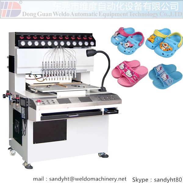 Weldo 12 Color soft PVC slipper cover making machine is to make soft PVCkeychains, key capsmachine for ,phone holders, cartoon USB drives, luggage tags, refrigerator magnets, photo frames, book marks ect. Our machine can be also produce plastic garment accessories such as PVC labels, silicone logos zipper pullers , hang tags ect.