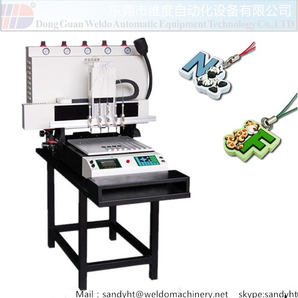 Weldo Soft PVC dispensing Machine for PVC bar Mat is to make soft PVC keychains, key caps,phone holders, cartoon USB drives, luggage tags, refrigerator magnets, photo frames , book marks , PVC bar mat ect. Our machine can be also produce plastic garment accessories such as PVC labels, silicone logos, zipper pullers ,hang tags ect.