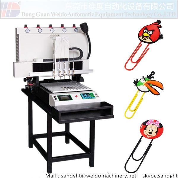 Weldo Soft PVC dispensing Machine for PVC bar Mat is to make soft PVC keychains, key caps,phone holders, cartoon USB drives, luggage tags, refrigerator magnets, photo frames , book marks , PVC bar mat ect. Our machine can be also produce plastic garment accessories such as PVC labels, silicone logos, zipper pullers ,hang tags ect.