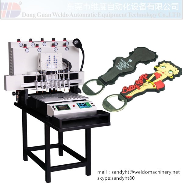 Weldo Soft PVC dispensing Machine for PVC bar Mat is to make soft PVC keychains, key caps,phone holders, cartoon USB drives, luggage tags, refrigerator magnets, photo frames , book marks , PVC bar mat ect. Our machine can be also produce plastic garment accessories such as PVC labels, silicone logos, zipper pullers ,hang tags ect.