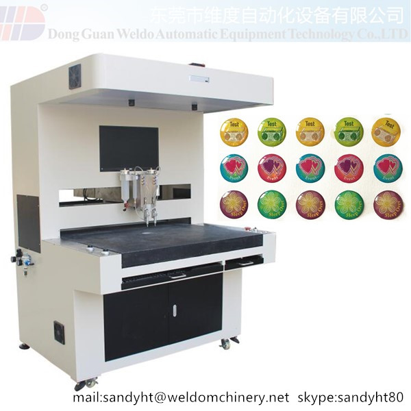 Weldo Epoxy Doming dispensing machine is used to bi-component mirco-injection ,the machine is applied double vision location system, and replaces tranditional manual injection to dispense epoxy on hang tags , labels , stickers ect .